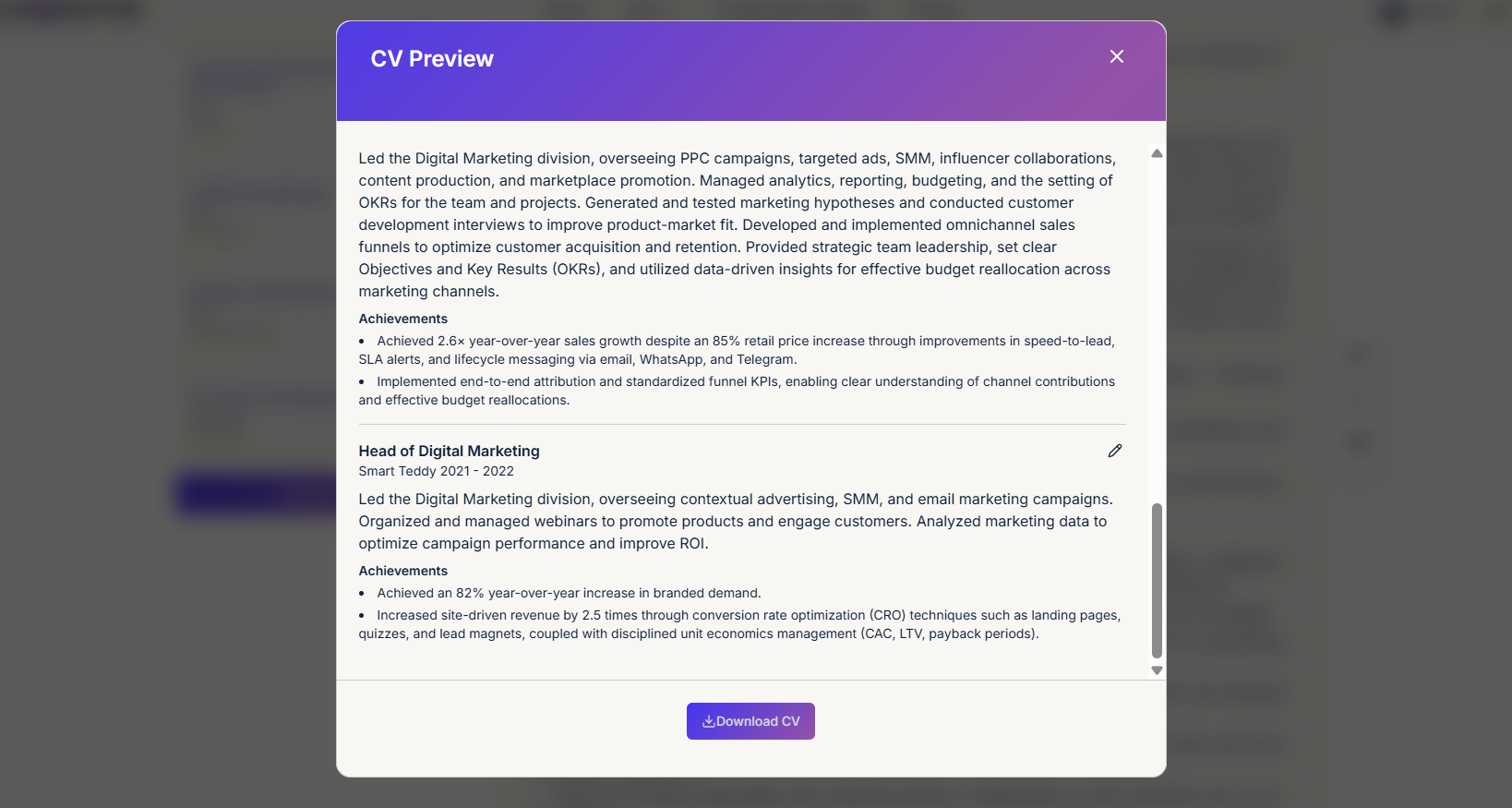 Одно резюме под все вакансии — главная причина отказов. Hire.Monster адаптирует ваше резюме под каждую вакансию одним кликом: не выдумывая лишнего, упаковывает ваш опыт, подставляет нужные формулировки, ключевые слова и структуру под требования работодателя и ATS-систем. Вы получаете готовый вариант под конкретную позицию без ручного копирования и правок.